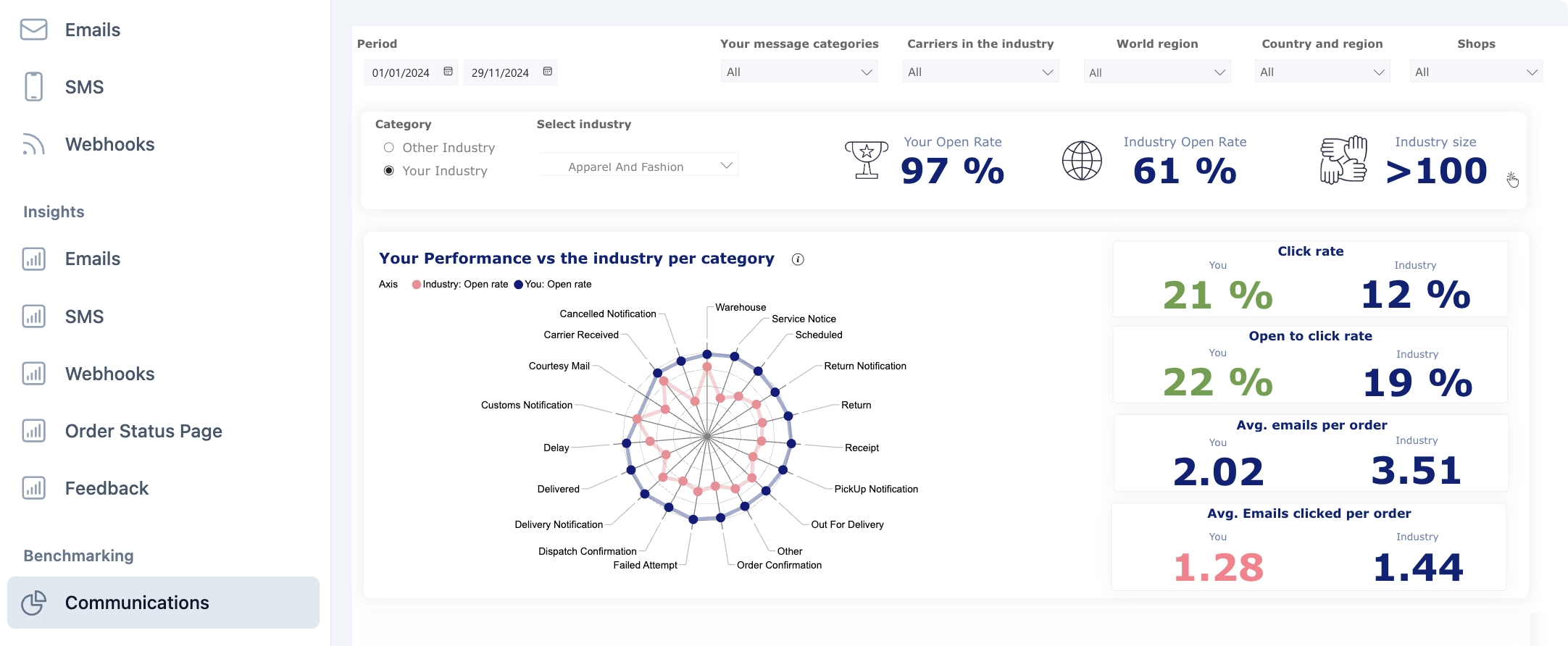 Our AI-powered Benchmarking analytics tool is now officially available! This feature allows you to gain key insights into the performance of your logistics and email communications against industry standards and identify areas for improvement. The Carrier and Communications reports for Benchmarking can be found in the Tracking and Communication modules respectively in the parcelLab App once the feature is enabled.