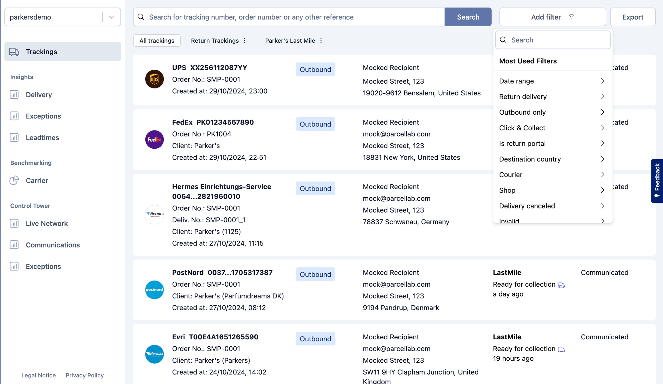 The Trackings module features an extended list of filters that can be used to customize search results and tracking data exports. Filter combinations can be saved as a view and easily applied across multiple parcelLab accounts.